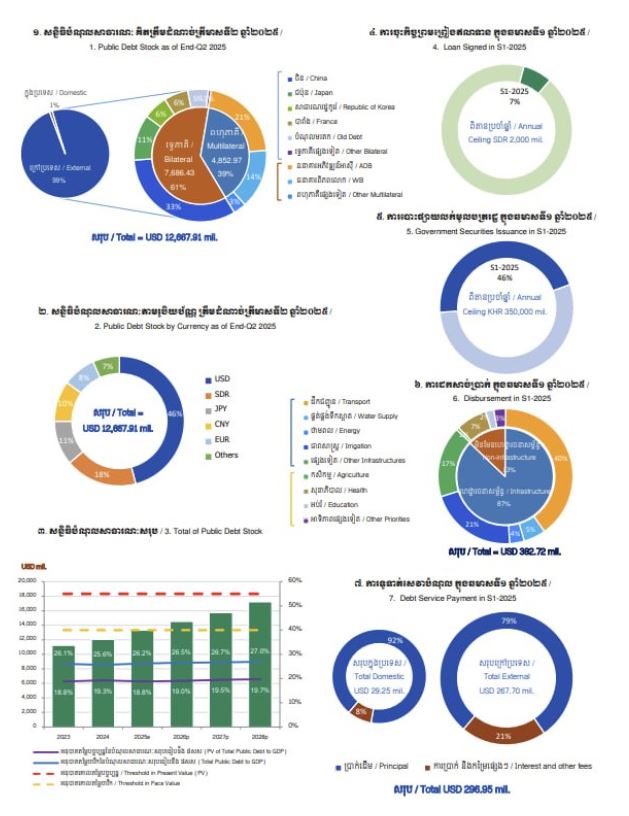 ការទូទាត់ក្នុងក្របខ័ណ្ឌបំណុលសាធារណៈក្រៅប្រទេសមានប្រមាណ ២៦៧.៧០លានដុល្លារអាម៉េរិក ក្នុងនោះ ប្រាក់ដើម ២១២.៣០លានដុល្លារអាម៉េរិក និងការប្រាក់ និងកម្រៃផ្សេងៗ ៥៥.៤០ លានដុល្លារអាម៉េរិក។ ចំណែកក្របខ័ណ្ឌ បំណុលសាធារណៈក្នុងប្រទេសមានចំនួនប្រមាណ ២៩.២៥ លានដុល្លារអាម៉េរិក ក្នុងនោះប្រាក់ដើម ២៦.៨២ លានដុល្លារអាម៉េរិក និងការប្រាក់២.៤៤ លានដុល្លារអាម៉េរិក។ បើធៀបនឹងរយៈពេលដូចគ្នាកាលពីឆ្នាំទៅ ការទូទាត់សេវាបំណុលសរុបក្នុងឆមាសទី១ ឆ្នាំ២០២៥ នេះ មានកំណើនប្រមាណ ២៩%។