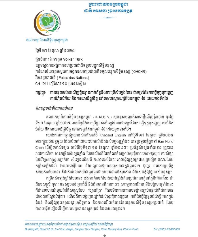 រាជធានីភ្នំពេញ៖តាមរយៈលិខិតរបស់ខ្លួន គណៈកម្មាធិការសិទ្ធិមនុស្សកម្ពុជា បានគូសបញ្ជាក់សាជាថ្មីលើញត្តិបន្ទាន់ ចុះថ្ងៃ ទី១១ ខែតុលា ឆ្នាំ២០២៥ ពាក់ព័ន្ធនឹងការប្រើប្រាស់សំឡេងរំខានជាទម្រង់នៃការធ្វើទុក្ខបុកម្នេញ ការបំភិត បំភ័យ និងការយាយីផ្លូវចិត្ត នៅតាមព្រំដែនកម្ពុជា-ថៃដោយប្រទេសថៃ។ យោងតាមការចុះផ្សាយរបស់កាសែតថៃ Khaosod English នៅថ្ងៃទី១៧ ខែតុលា ឆ្នាំ២០២៥ មានក្បួនរថយន្តមួយ ដែលបំពាក់ដោយឧបករណ៍បំពងសំឡេងឮខ្លាំងៗ បានប្រមូលផ្តុំគ្នានៅ Ban Nong Chan ដើម្បីចាក់សំឡេង ចាប់ពីថ្ងៃទី១៧-១៩ ខែតុលា ឆ្នាំ២០២៥។ ប្រព័ន្ធសំឡេងទាំងនោះ ត្រូវបាន រាយការណ៍ថា មានកម្រិតសំឡេងខ្លាំង ដែលលើសពីដែនកំណត់សម្រាប់សុវត្ថិភាពរបស់មនុស្ស។ ការសិក្សាបែបវិទ្យាសាស្ត្របញ្ជាក់ថា សំឡេងលើសពី ១៤០ដេស៊ីបែល អាចធ្វើឱ្យខូចក្រដាសត្រចៀក ខណៈដែល កម្រិតឡើងដល់ ២០០ដេស៊ីបែល នឹងបណ្តាលឱ្យមានរបួសខាងក្នុងធ្ងន់ធ្ងរ។ ដូច្នេះ រាល់ការប្រព្រឹត្ត សកម្មភាពបែបនេះ គឺជាការរំលោភយ៉ាងធ្ងន់ធ្ងរដោយចេតនាលើសុខភាព និងសេចក្តីថ្លៃថ្នូររបស់មនុស្ស។