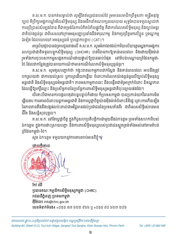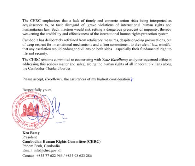 គណៈកម្មាធិការសិទ្ធិមនុស្សកម្ពុជា «សូមអំពាវនាវដល់ការិយាល័យឧត្តមស្នងការអង្គការ សហប្រជាជាតិទទួលបន្ទុកសិទ្ធិមនុស្ស (OHCHR) ចាត់វិធានការឱ្យទាន់ពេលវេលា និងដោយម៉ឺងម៉ាត់ រួមទាំងការចុះបេសកកម្មសង្កេតការណ៍ដោយផ្ទាល់ឱ្យបានឆាប់បំផុត នៅតំបន់បណ្តោយព្រំដែនកម្ពុជា-ថៃ ដែលជាកន្លែងត្រូវបានរាយការណ៍ថា មានករណីរំលោភសិទ្ធិមនុស្សធ្ងន់ធ្ងរ»។