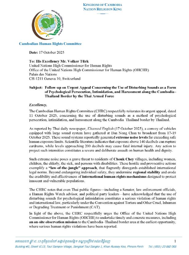 លោក កែវ រ៉េមី ប្រធានគណៈកម្មាធិការសិទ្ធិមនុស្សកម្ពុជា នៅថ្ងៃទី១៧ ខែតុលា ឆ្នាំ២០២៥ បានដាក់លិខិតបន្ទាន់មួយថ្មីទៀត ផ្ញើជូនលោក Volker Turk ឧត្តមស្នងការអង្គការសហប្រជាជាតិ ទទួលបន្ទុកសិទ្ធិមនុស្ស (OHCHR) ស្នើឱ្យមានការវិធានការបន្ទាន់ ចុះសង្កេតការណ៍ដោយផ្ទាល់ឱ្យបានឆាប់បំផុត ពាក់ព័ន្ធនឹងការប្រើសំឡេងរំខាន ជាទម្រង់នៃការធ្វើទុក្ខបុកម្នេញ ការបំភិតបំភ័យ និងការយាយីផ្លូវចិត្ត នៅតាមបណ្តោយព្រំដែនកម្ពុជា-ថៃ។