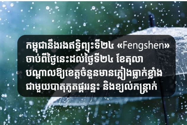 កម្ពុជានឹងរងឥទ្ធិព្យុះទី២៤ «Fengshen» ចាប់ពីថ្ងៃនេះដល់ថ្ងៃទី២៤ ខែតុលា បណ្តាលឱ្យខេត្តចំនួនមានភ្លៀងធ្លាក់ខ្លាំង ជាមួយបាតុភូតផ្គររន្ទះ និងខ្យល់កន្ត្រាក់ |