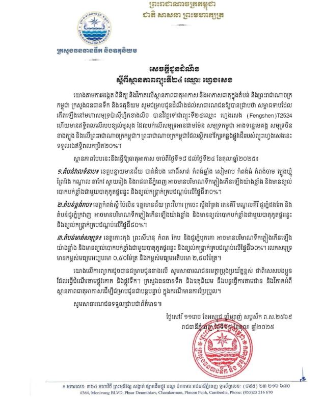 ក្រសួងធនធានទឹក និងឧតុនិយម នាថ្ងៃទី១៨ ខែតុលា ឆ្នាំ២០២៥នេះ បានចេញសេចក្តីជូនដំណឹងស្តីពីស្ថានភាពព្យុះ ទី២៤ ឈ្មោះ ហ្វេងសេង (Fengshen) T2524 ដែលកម្ពុជានឹងរងសម្ពាធព្យុះនេះ នឹងធ្វើឱ្យខេត្តចំនួននឹងអាចមានបរិមាណទឹកភ្លៀងកើនឡើងយ៉ាងខ្លាំង និងមានខ្យល់បោកបក់ខ្លាំងជាមួយបាតុភូតផ្គររន្ទះ និងខ្យល់កន្ត្រាក់។