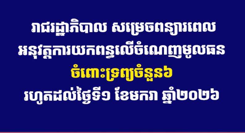 | រាជរដ្ឋាភិបាល សម្រេចពន្យារពេលអនុវត្តការយកពន្ធលើចំណេញមូលធន ចំពោះទ្រព្យចំនួន៦ រហូតដល់ថ្ងៃទី១ ខែមករា ឆ្នាំ២០២៦ |
