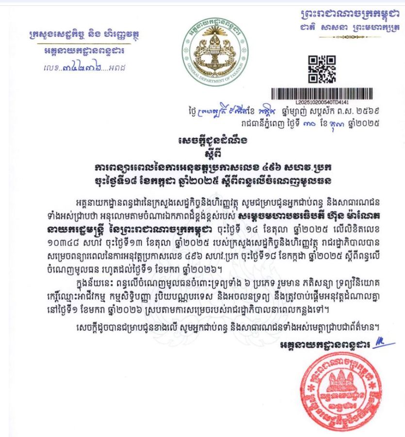 អគ្គនាយកដ្ឋានពន្ធដារបានបញ្ជាក់ថា អនុលោមតាមចំណារឯកភាពដ៏ខ្ពង់ខ្ពស់របស់ សម្តេចមហាបវរធិបតី ហ៊ុន ម៉ាណែត នាយករដ្ឋមន្ត្រី នៃកម្ពុជា ចុះថ្ងៃទី១៤ ខែតុលា ឆ្នាំ២០២៥ លើលិខិតលេខ ១០៣៤៨ សហវ ចុះថ្ងៃទី១៣ ខែតុលា ឆ្នាំ២០២៥ របស់ក្រសួងសេដ្ឋកិច្ចនិងហិរញ្ញវត្ថុ រាជរដ្ឋាភិបាលបាន សម្រេចពន្យារពេលនៃការអនុវត្តប្រកាសលេខ ៤៩៦ សហវ.ប្រក ចុះថ្ងៃទី១៨ ខែកក្កដា ឆ្នាំ២០២៥ ស្តីពីពន្ធលើ ចំណេញមូលធន រហូតដល់ថ្ងៃទី១ ខែមករា ឆ្នាំ២០២៦។