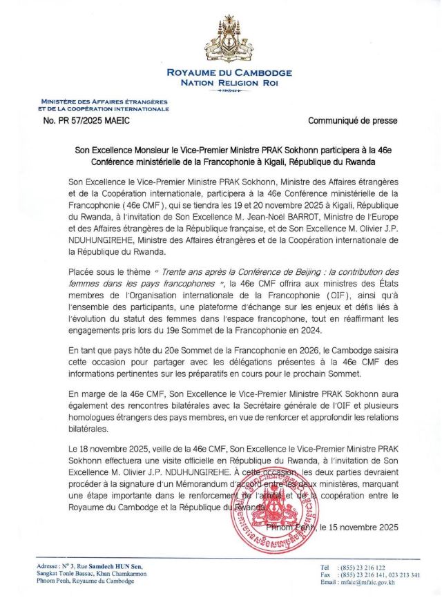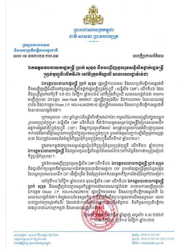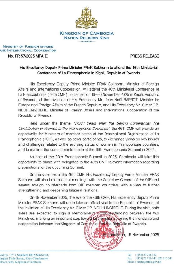 រាជធានីភ្នំពេញ៖ក្លោកឧបនាយករដ្ឋមន្ត្រី ប្រាក់ សុខុន រដ្ឋមន្ត្រីការបរទេស និងសហប្រតិបត្តិការអន្តរជាតិ នឹងអញ្ជើញធ្វើដំណើរទៅចូលរួមសន្និសីទថ្នាក់រដ្ឋមន្ត្រីហ្វ្រង់កូហ្វនី (សន្និសីទ CMF) លើកទី៤៦ ដែល នឹងប្រព្រឹត្តទៅនៅថ្ងៃទី ១៩-២០ ខែវិច្ឆិកា ឆ្នាំ២០២៥ នៅទីក្រុងគឺហ្គាលី សាធារណរដ្ឋរវ៉ាន់ដា តាមការ អ