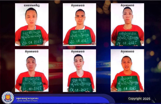 រាជធានីភ្នំពេញ៖ អគ្គនាយកដ្ឋានពន្ធនាគារ ក្រសួងមហាផ្ទៃ នៅរសៀលថ្ងៃទី១៨ ខែវិច្ឆិកា ឆ្នាំ២០២៥នេះ បានបង្ហាញមុខឧក្រិដ្ឋជនជនជាតិវៀតណាម ចំនួន៦នាក់ ដែលត្រូវបានគេរំដោះចេញពីបរិវេណសាលាដំបូងខេត្តស្វាយរៀង កាលពីព្រឹកមិញ។