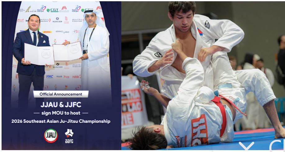 សូមជម្រាបផងថា កាលពីថ្ងៃទី០៩ ខែវិច្ឆិកា ឆ្នាំ២០២៥ សហព័ន្ធកីឡាជឺជីតស៊ូកម្ពុជា (JJFC) ដឹកនាំដោយលោក ថោង បញ្ញាធន ប្រធានសហព័ន្ធ និងលោក Jasspaner Martijn Paas អនុប្រធានទី១ បានចុះហត្ថលេខាជាផ្លូវការលើអនុស្សរណៈនៃការយោគយល់គ្នា (MOU) ជាមួយសហភាពជឺជីតស៊ូទ្វីបអាស៊ី (JJAU) ដែលតំណាងដោយលោក Fahad Al Shamsi អគ្គលេខាធិការ នៃសហភាពជឺជីតស៊ូទ្វី