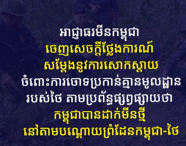 | អាជ្ញាធរមីនកម្ពុជា ចេញសេចក្តីថ្លែងការណ៍ សម្តែងនូវការសោកស្តាយចំពោះការចោទប្រកាន់គ្មានមូលដ្ឋានរបស់ថៃ តាមប្រព័ន្ធផ្សព្វផ្សាយថា កម្ពុជាបានដាក់មីនថ្មី នៅតាមបណ្តោយព្រំដែនកម្ពុជា-ថៃ |