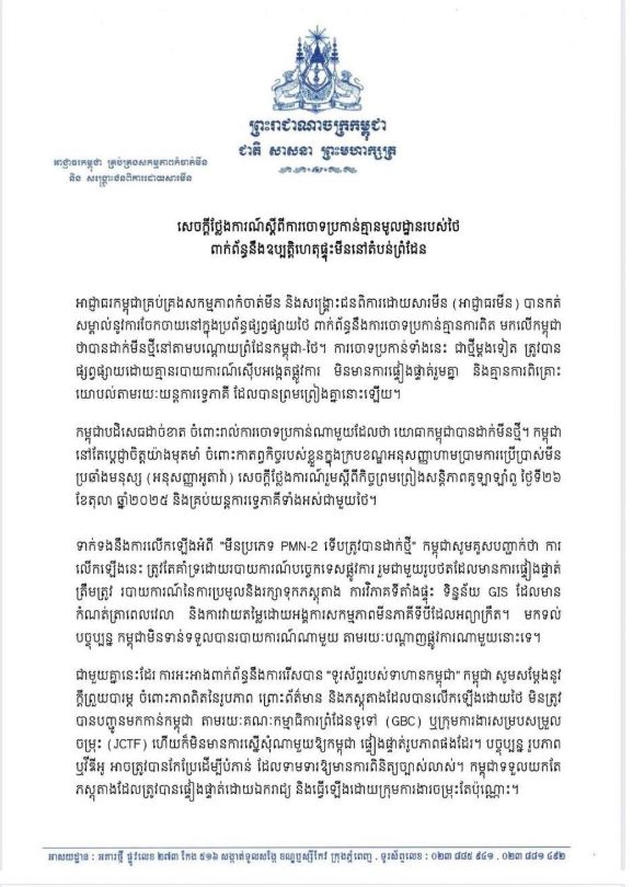 សេចក្តីថ្លែងការណ៍បានបញ្ជាក់ថា «កម្ពុជាបដិសេធដាច់ខាត ចំពោះរាល់ការចោទប្រកាន់ណាមួយដែលថា យោធាកម្ពុជាបានដាក់មីនថ្មី។ កម្ពុជានៅតែប្តេជ្ញាចិត្តយ៉ាងមុតមាំ ចំពោះកាតព្វកិច្ចរបស់ខ្លួនក្នុងក្របខណ្ឌអនុសញ្ញាហាមប្រាមការប្រើប្រាស់មីន ប្រឆាំងមនុស្ស (អនុសញ្ញាអូតាវ៉ា) សេចក្តីថ្លែងការណ៍រួមស្តីពីកិច្ចព្រមព្រៀងសន្តិភាពគូឡាឡាំពួ ថ្ងៃទី២៦ ខែតុលា ឆ្នាំ២០២៥ និងគ្រប់យន្តការទ្វេភាគីទាំងអស់ជាមួយថៃ»។