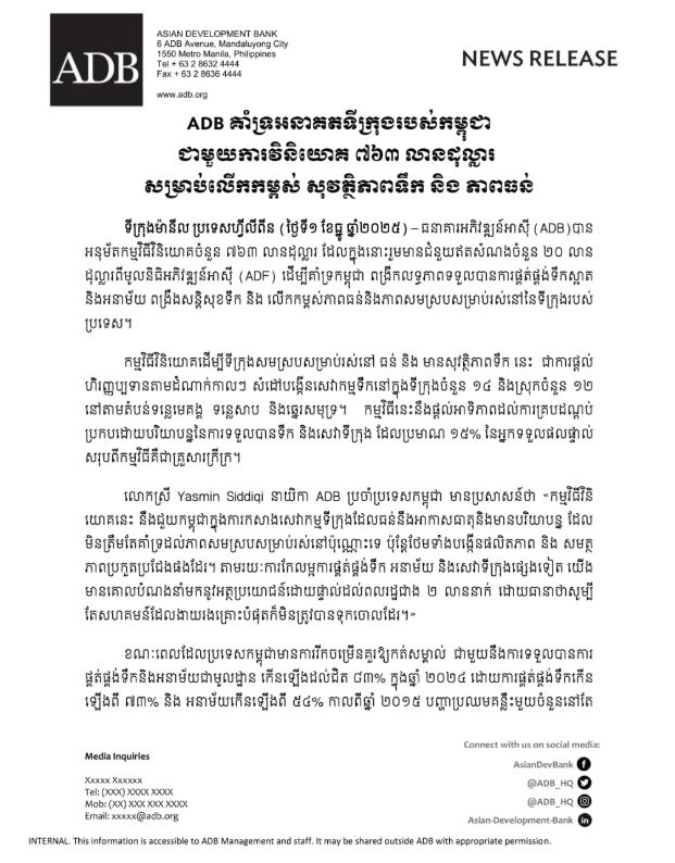 ធនាគារអភិវឌ្ឍន៍អាស៊ី (ADB) នៅថ្ងៃទី១ ខែធ្នូ ឆ្នាំ២០២៥នេះ បានអនុម័តកម្មវិធីវិនិយោគចំនួន ៧៦៣ លានដុល្លារ ដែលក្នុងនោះរួមមានជំនួយឥតសំណងចំនួន ២០ លានដុល្លារពីមូលនិធិអភិវឌ្ឍន៍អាស៊ី (ADF) ដើម្បីគាំទ្រកម្ពុជា ពង្រីកលទ្ធភាពទទួលបានការផ្គត់ផ្គង់ទឹកស្អាត និងអនាម័យ ពង្រឹងសន្តិសុខទឹក និង លើកកម្ពស់ភាពធន់ និងភាពសមស្របសម្រាប់រស់នៅនៃទីក្រុងរបស់ប្រទេស។