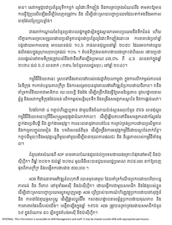 លោកស្រី Yasmin Siddiqi នាយិកា ADB ប្រចាំប្រទេសកម្ពុជា មានប្រសាសន៍ថា «កម្មវិធីវិនិយោគនេះ នឹងជួយកម្ពុជាក្នុងការកសាងសេវាកម្មទីក្រុង ដែលធន់នឹងអាកាសធាតុ និងមានបរិយាបន្ន ដែលមិនត្រឹមតែគាំទ្រដល់ភាពសមស្របសម្រាប់រស់នៅប៉ុណ្ណោះទេ ប៉ុន្តែថែមទាំងបង្កើនផលិតភាព និងសមត្ថភាពប្រកួតប្រជែងផងដែរ។ តាមរយៈការកែលម្អការផ្គត់ផ្គង់ទឹក អនាម័យ និងសេវាទីក្រុងផ្សេងទៀត យើងមានគោលបំណងនាំមកនូវអត្ថប្រយោជន៍ដោយផ្ទាល់ ដល់ពលរដ្ឋជាង ២ លាននាក់ ដោយធានាថាសូម្បីតែសហគមន៍ដែលងាយរងគ្រោះបំផុតក៏មិនត្រូវបានទុកចោលដែរ»។
