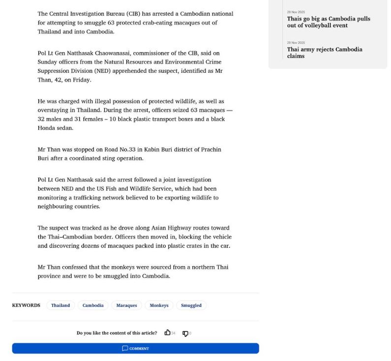 ការបញ្ជាក់នេះ ធ្វើឡើងក្រោយកាសែត Bangkok Post របស់ប្រទេសថៃ បានផ្សាយពីការឃាត់ករណីប៉ុនប៉ងរត់ពន្ធសត្វស្វាក្ដាមពីប្រទេសថៃ ចូលមកកម្ពុជា។ ការណ៍នេះ ត្រូវបានក្រសួងកសិកម្ម ទាត់ចោលនូវការចោទប្រកាន់គ្មានមូលដ្ឋានបែបនេះ។