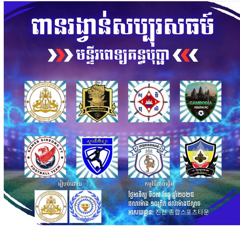 សាធារណរដ្ឋកូរ៉េ៖ បងប្អូនពលករខ្មែរ និងនិស្សិតខ្មែរនៅកូរ៉េនឹងប្រកួតបាល់ទាត់ពានរង្វាន់សប្បុរសធម៌ ដើម្បីរៃអង្គាសថវិកាជូនមន្ទីរពេទ្យកុមារគន្ធបុប្ផា នាថ្ងៃទី៧ ខែធ្នូ ឆ្នាំ២០២៥ នៅកីឡដ្ឋាន ជីនឆុន ស្ព័តថោន ក្រោមការសហការរៀបចំដោយក្រសួងការងារ និងបណ្តុះបណ្តាលវិជ្ជាជីវៈ និងស្ថានឯកអគ្គរាជទូតកម្ព