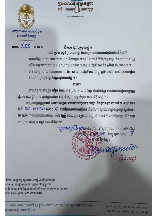 រាជធានីភ្នំពេញ៖នៅថ្ងៃទី០៤ ខែមករា ឆ្នាំ២០២៦នេះទៀតថា ការឃាត់ខ្លួនជនសង្ស័យខាងលើនេះ ធ្វើឡើងបន្ទាប់ពីមានពាក្យបណ្ដឹងរបស់ជនរងគ្រោះ ដោយចោទប្រកាន់ថាជនសង្ស័យឈ្មោះ មៀច ហាន បានឆបោកប្រាក់ចំនួន ១៦ម៉ឺនដុល្លារ កាលពីថ្ងៃទី១៣ ខែកញ្ញា ឆ្នាំ២០២៤ ក្នុងការរត់ការចូលសញ្ជាតិខ្មែរ។