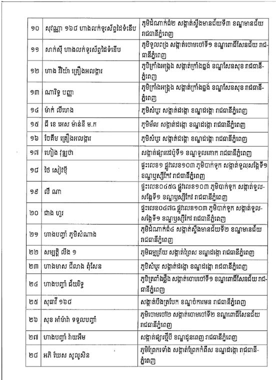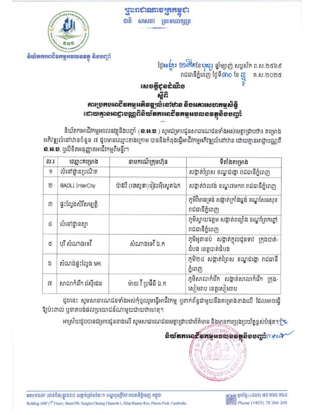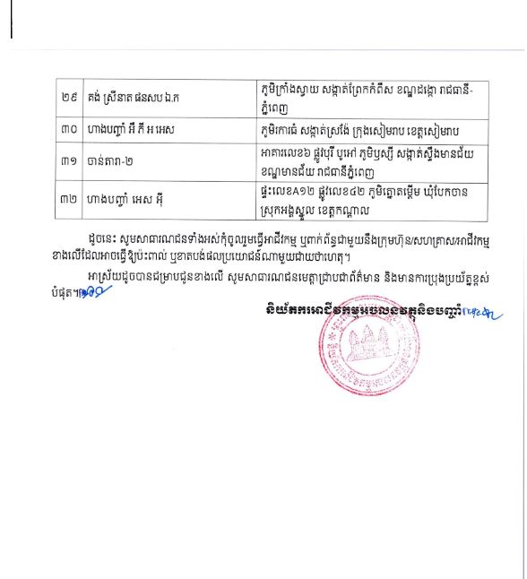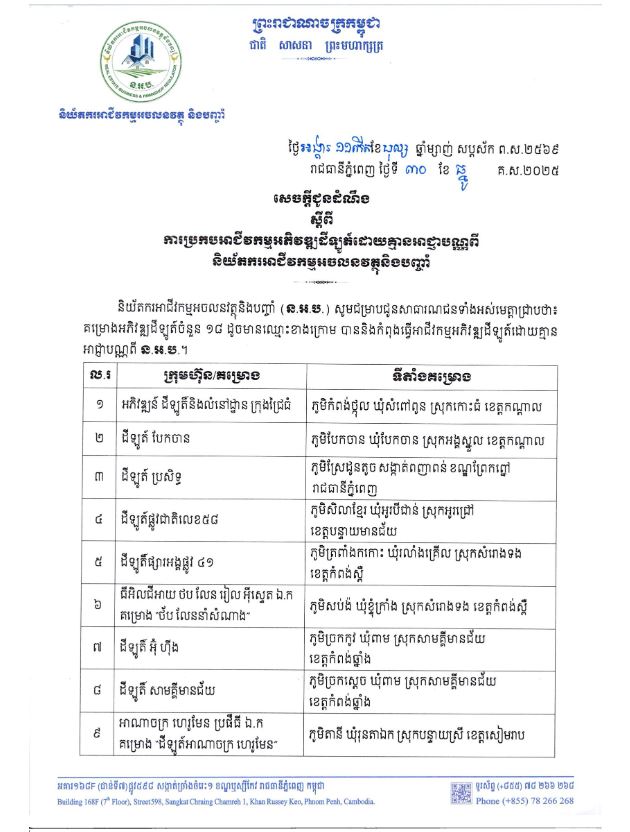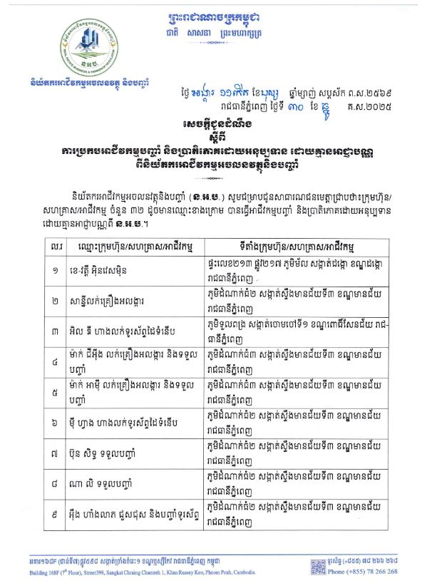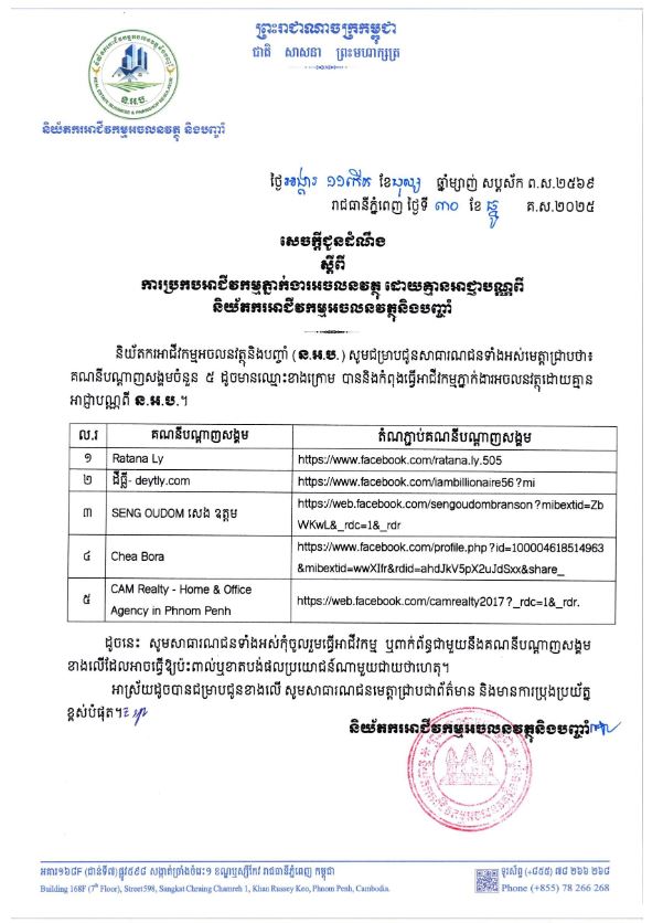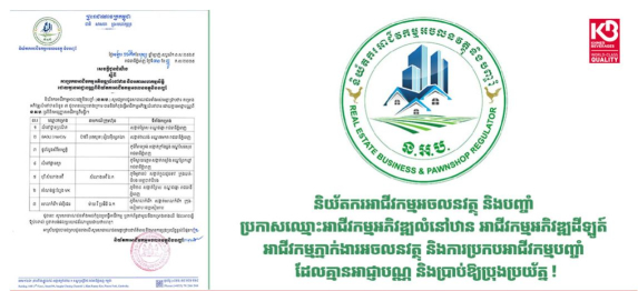 រាជធានីភ្នំពេញ៖អ និយ័តករអាជីវកម្មអចលនវត្ថុ និងបញ្ចាំ បានចេញសេចក្តីជូនដំណឹង ដោយប្រកាសឈ្មោះអាជីវកម្មអភិវឌ្ឍលំនៅឋាន និងអគារសហកម្មសិទ្ធិ, ការប្រកបអាជីវកម្មអភិវឌ្ឍដីឡូត៍, ការប្រកបអាជីវកម្មភ្នាក់ងារអចលនវត្ថុ និងការប្រកបអាជីវកម្មបញ្ចាំ និងប្រាតិភោគដោយអនុប្បទាន ដោយគ្មានអាជ្ញាបណ្ណពីនិយ័តករអាជីវកម្មអចលនវត្ថុ និងបញ្ចាំ។