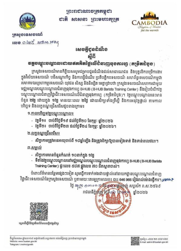 តាមរយៈសេចក្តីជូនដំណឹងរបស់ក្រសួងទេសចរណ៍ នៅថ្ងៃទី១៨ ខែមករា ឆ្នាំ២០២៦ បានបញ្ជាក់ថា សូមជម្រាបជូនដំណឹងដល់សាធារណជន និងបុគ្គលិកបម្រើការងារ ក្នុងវិស័យទេសចរណ៍ បដិសណ្ឋារកិច្ច និងការធ្វើដំណើរ ប្រតិបត្តិករទេសចរណ៍ សហព័ន្ធទេសចរណ៍កម្ពុជា សមាគមឧស្សាហកម្មទេសចរណ៍ យុវជន សិស្ស និងនិស្សិត មេត្តាជ្រាបថា ក្រសួងទេសចរណ៍សហការជាមួយ មជ្ឈមណ្ឌលបណ្តុះបណ្តាលជំនាញឆុងកាហ្វេ B-HUB (B-HUB Barista Training Center) នឹងរៀបចំបើកវគ្គ បណ្តុះបណ្តាលជំនាញវិជ្ជាជីវៈទេសចរណ៍លើជំនាញឆុងកាហ្វេ (កម្រិតដំបូង)។