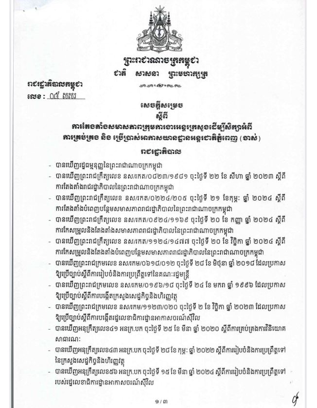 រាជធានីភ្នំពេញ៖សម្តេចមហាបវរធិបតី ហ៊ុន ម៉ាណែត នាយករដ្ឋមន្ត្រីនៃកម្ពុជា បានចេញសេចក្តីសម្រេចស្តីពី ការតែងតាំងសមាសភាពក្រុមការងារអន្តរក្រសួង ដើម្បីសិក្សាអំពីការគ្រប់គ្រង និងប្រើប្រាស់អាកាសយានដ្ឋានអន្តរជាតិភ្នំពេញ (ចាស់)។