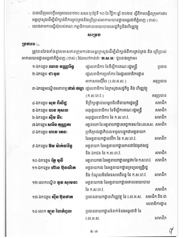 តាមសេចក្តីសម្រេចរបស់សម្តេចបវរធិបតី ហ៊ុន ម៉ាណែត បានបញ្ជាក់ថា ត្រូវបានតែងតាំងនូវសមាសភាពក្រុមការងារអន្តរក្រសួងដើម្បីសិក្សាអំពីការគ្រប់គ្រង និងប្រើប្រាស់ អាកាសយានដ្ឋានអន្តរជាតិភ្នំពេញ (ចាស់) ដែលហៅកាត់ថា “ក.ស.អ.” ដែលមានលោក ឈាង វណ្ណារិទ្ធ រដ្ឋលេខាធិការ នៃទីស្តីការគណៈរដ្ឋមន្ត្រី ជាប្រធាន អមដោយអនុប្រធាន និងសមាជិកជាច្រើនរូបទៀត៕