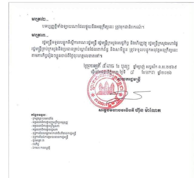 ខាងក្រោមនេះ ជាអនុក្រឹត្យរបស់សម្ដេចបវរធិបតី ហ៊ុន ម៉ាណែត៖