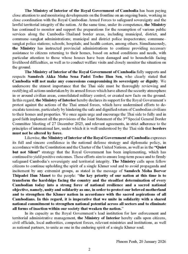 រាជធានីភ្នំពេញ៖«ក្រសួងមហាផ្ទៃ នៅព្រឹកថ្ងៃទី២០ ខែមករា ឆ្នាំ២០២៦នេះ បានឲ្យដឹងថា គិតចាប់ពីម៉ោង៦ព្រឹក ថ្ងៃទី៩ ខែមករា ដល់ម៉ោង៦ព្រឹក ថ្ងៃទី២០ ខែមករា ឆ្នាំ២០២៦នេះ មានពលរដ្ឋភៀសសឹក៥,៥៥១នាក់បន្ថែមទៀត បានបន្តវិលត្រឡប់ទៅលំនៅឋានវិញ ដូច្នេះក្នុងចំណោមពលរដ្ឋភៀសសឹកសរុបជាង៦សែន៤ម៉ឺននាក់ មានប្រមាណ៥សែន២ម