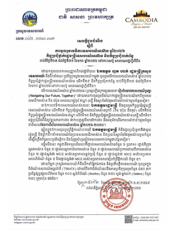 ក្រសួងទេសចរណ៍ ចេញសេចក្ដីជូនដំណឹង ស្តីពី «ការចូលរួមវេទិកាទេសចរណ៍អាស៊ាន ឆ្នាំ២០២៦» កិច្ចប្រជុំថ្នាក់រដ្ឋមន្ត្រីទេសចរណ៍អាស៊ាន និងកិច្ចប្រជុំពាក់ព័ន្ធ រយៈពេល៤ថ្ងៃ ចាប់ពីថ្ងៃទី២៧ ដល់ថ្ងៃទី៣១ ខែមករា ឆ្នាំ២០២៦ នៅកោះសេប៊ូ សាធារណរដ្ឋហ្វីលីពីន។