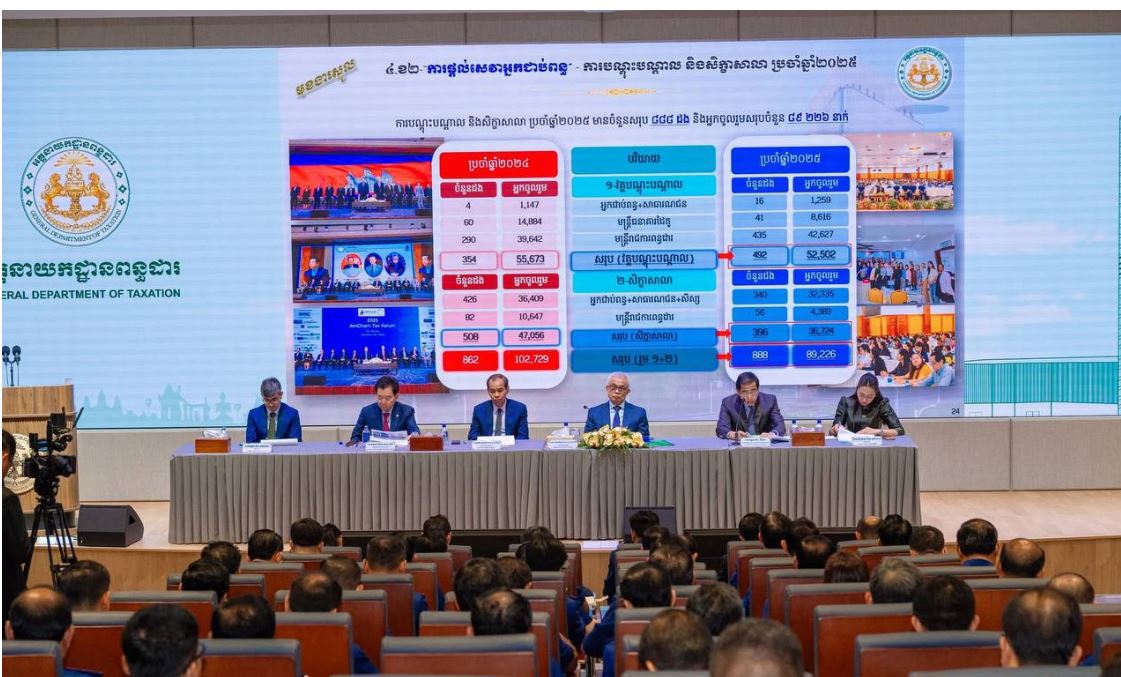 របាយការណ៍នៃការប្រមូលចំណូលពន្ធដារឆ្នាំ២០២៥ ត្រូវបានបង្ហាញក្នុងកិច្ចប្រជុំបូកសរុបលទ្ធផលការងារ ប្រមូលចំណូលពន្ធប្រចាំឆ្នាំ២០២៥ ព្រមទាំងទិសដៅអនុវត្តបន្តរបស់អគ្គនាយកដ្ឋានពន្ធដារ ក្រោមអធិបតីភាពអគ្គបណ្ឌិតសភាចារ្យ អូន ព័ន្ធមុនីរ័ត្ន ឧបនាយករដ្ឋមន្ដ្រី រដ្ឋមន្ត្រីក្រសួងសេដ្ឋកិច្ច និងហិរញ្ញវត្ថុ នៅអគារអគ្គនាយកដ្ឋានពន្ធដារថ្មី (Tax Tower) ដែលស្ថិតនៅតំបន់ជ្រោយចង្វារ។