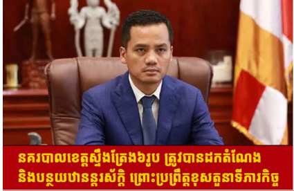 រាជធានីភ្នំពេញ៖លោកឧបនាយករដ្ឋមន្ត្រី ស សុខា រដ្ឋមន្ត្រីក្រសួងមហាផ្ទៃ បានសម្រេចដកហូតមុខតំណែង និងបន្ថយឋានន្តរស័ក្តិ នគរបាលបាលខេត្តស្ទឹងត្រែង ចំនួន ៦រូប ក្នុងនោះមានម្នាក់ជាឧត្តមសេនីយ៍ត្រី (ផ្កាយ១) ផងដែរ ព្រោះប្រព្រឹត្តល្មើសវិន័យនគរបាល។