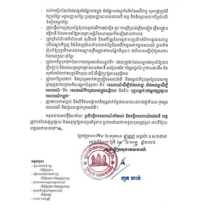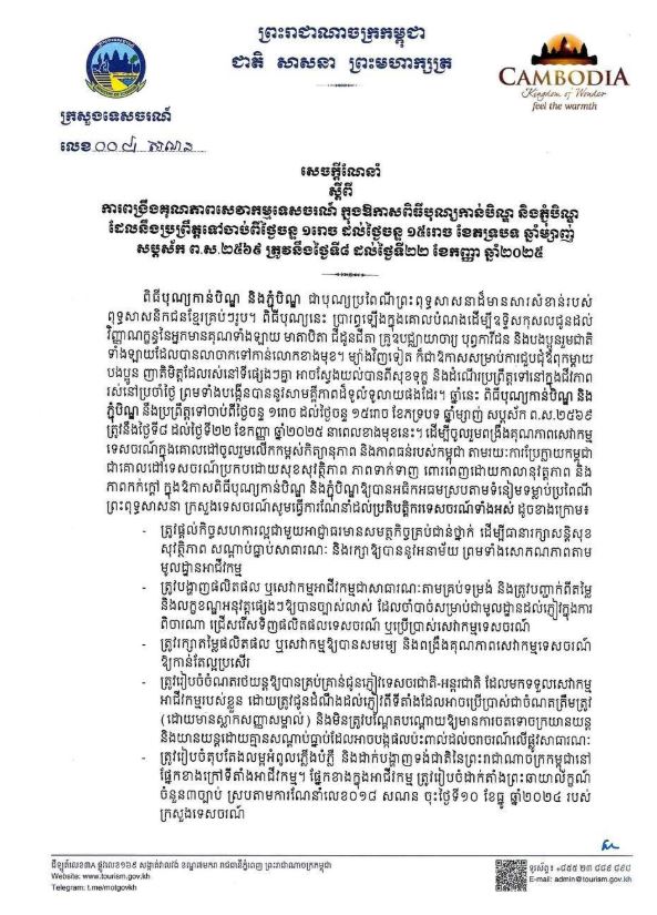 រាជធានីភ្នំពេញ៖យោងតាមសេចក្ដីណែនាំរបស់ក្រសួងទេសចរណ៍ បានបង្ហាញថា ដើម្បីចូលរួមពង្រឹងគុណភាពសេវាកម្មទេសចរណ៍ ក្នុងគោលដៅចូលរួមលើកកម្ពស់កិត្យានុភាព និងភាពធន់របស់កម្ពុជា តាមរយៈការប្រែក្លាយកម្ពុជា ជាគោលដៅទេសចរណ៍ ប្រកបដោយសុខសុវត្ថិភាព ភាពទាក់ទាញ ពោរពេញដោយកាលានុវត្តភាព និងភាពកក់ក្តៅ ក្នុងឱកាសពិធីបុណ្យកាន់បិណ្ឌ និងភ្ជុំបិណ្ឌក្រសួងទេសចរណ៍ នៅថ្ងៃទី៤ ខែកញ្ញា ឆ្នាំ២០២៥នេះ បានចេញសេចក្ដីណែនាំស្ដីពី «ការពង្រឹងគុណភាពសេវាកម្មទេសចរណ៍ ក្នុងឱកាសពិធីបុណ្យកាន់បិណ្ឌ និងភ្ជុំបិណ្ឌ» ដែលនឹងប្រព្រឹត្តទៅចាប់ពីថ្ងៃចន្ទ ១រោច ដល់ថ្ងៃចន្ទ ១៥រោច ខែភទ្របទ ឆ្នាំម្សាញ់ សប្ដស័ក ព.ស.២៥៦៩ ត្រូវនឹងថ្ងៃទី៨ ដល់ថ្ងៃទី២២ ខែកញ្ញា ឆ្នាំ២០២៥។ ឱ្យបានអធិកអធម ស្របតាមទំនៀមទម្លាប់ប្រពៃណី ព្រះពុទ្ធសាសនា ក្រសួងទេសចរណ៍ បានណែនាំដល់ប្រតិបត្តិករទេសចរណ៍ទាំងអស់ ដូចខាងក្រោម៖