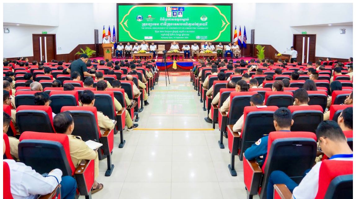 លោក ហួត ហាក់ រដ្ឋមន្ត្រីក្រសួងទេសចរណ៍ រួមជាមួយលោកបណ្ឌិត ជាម ច័ន្ទសោភ័ណ អភិបាលនៃគណៈអភិបាលខេត្តកំពង់ស្ពឺ និងលោកស្រី Dr. Marianna Trias ប្រធានអង្គការសុខភាពពិភពលោកប្រចាំកម្ពុជា បានអញ្ជើញជាគណៈអធិបតី ក្នុងពិធីប្រកាសជាផ្លូវការ «ក្រុងច្បារមនជាទីក្រុងទេសចរណ៍គ្មានផ្សែងបារី» នាថ្ងៃទី១០ ខែកញ្ញា ឆ្នាំ២០២៥នេះ នៅរដ្ឋបាលខេត្តកំពង់ស្ពឺ។