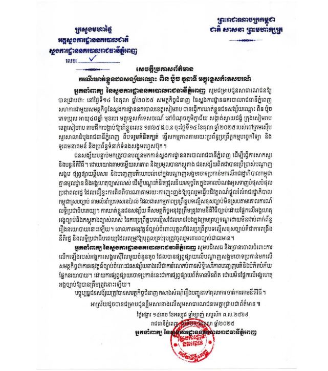 សមត្ថកិច្ចជំនាញ នៃស្នងការដ្ឋាននគរបាលរាជធានីភ្នំពេញ សហការជាមួយសមត្ថកិច្ច នៃស្នងការដ្ឋាននគរបាលខេត្តសៀមរាប នៅថ្ងៃទី១៤ ខែតុលា ឆ្នាំ២០២៥ បានធ្វើការ ឃាត់ខ្លួនជនសង្ស័យឈ្មោះ ពិន ប៉ូច ភេទប្រុស អាយុ៤៨ឆ្នាំ មុខរបរ មគ្គុទ្ទេសក៍ទេសចរណ៍ នៅចំណុចភូមិភ្ញាជ័យ សង្កាត់ស្វាយដង្គំ ក្រុងសៀមរាប ខេត្តសៀមរាប។ នេះបើតាមសេចក្តីប្រកាសព័ត៌មាន របស់អ្នកនាំពាក្យនៃស្នងការដ្ឋាននគរបាលរាជធានីភ្នំពេញ។