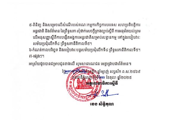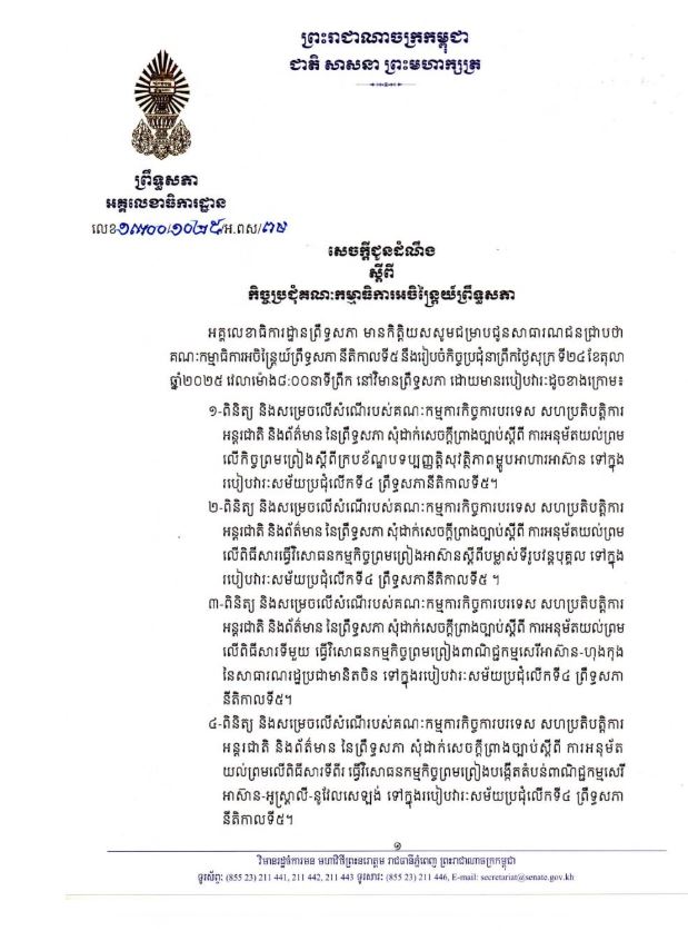 រាជធានីភ្នំពេញ៖ព្រឹទ្ធសភា ចេញសេចក្ដីជូនដំណឹងស្ដីពី គណៈកម្មាធិការអចិន្ត្រៃយ៍ព្រឹទ្ធសភា នីតិកាលទី៥ នឹងរៀបចំកិច្ចប្រជុំ នាព្រឹកថ្ងៃទី២៤ ខែតុលា ឆ្នាំ២០២៥ នៅវិមានព្រឹទ្ធសភា។នៅថ្ងៃទី២៣ ខែតុលា ឆ្នាំ២០២៥នេះ បានបញ្ជាក់ថា មានរបៀបវារៈចំនួន៧ មានដូចខាងក្រោម៖