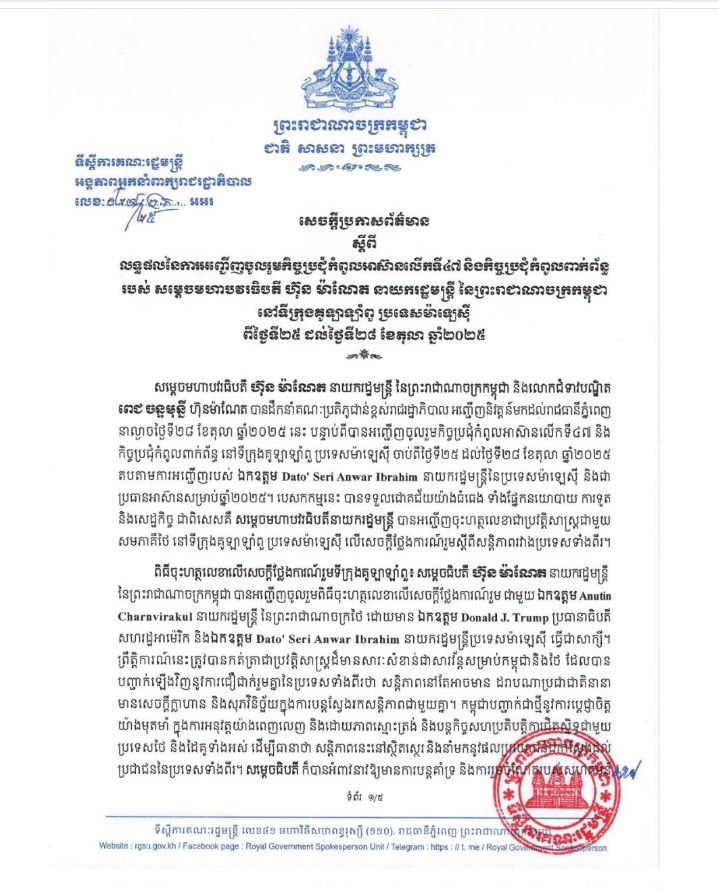 រាជធានីភ្នំពេញអង្គភាពអ្នកនាំពាក្យរាជរដ្ឋាភិបាល នៅយប់ថ្ងៃទី២៨ ខែតុលា ឆ្នាំ២០២៥នេះ បានចេញសេចក្តីប្រកាសព័ត៌មាន ស្តីពីលទ្ធផលនៃការអញ្ជើញចូលរួមកិច្ចប្រជុំកំពូលអាស៊ាន លើកទី៤៧ និងកិច្ចប្រជុំកំពូលពាក់ព័ន្ធ របស់សម្តេចបវរធិបតី ហ៊ុន ម៉ាណែត នាយករដ្ឋមន្ត្រីនៃកម្ពុជា និងលោកជំទាវបណ្ឌិត នៅទីក្រុងកូឡាឡំពួ ប្រទេសម៉ាឡេស៊ី។