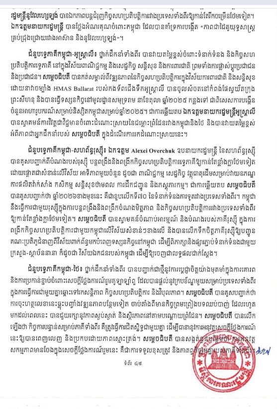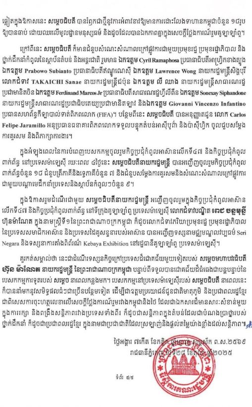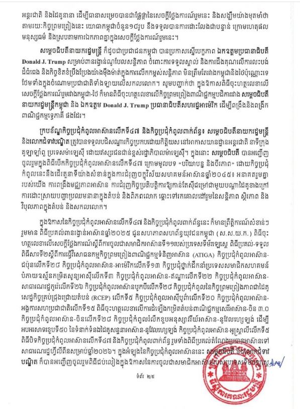 រាជធានីភ្នំពេញអង្គភាពអ្នកនាំពាក្យរាជរដ្ឋាភិបាល នៅយប់ថ្ងៃទី២៨ ខែតុលា ឆ្នាំ២០២៥នេះ បានចេញសេចក្តីប្រកាសព័ត៌មាន ស្តីពីលទ្ធផលនៃការអញ្ជើញចូលរួមកិច្ចប្រជុំកំពូលអាស៊ាន លើកទី៤៧ និងកិច្ចប្រជុំកំពូលពាក់ព័ន្ធ របស់សម្តេចបវរធិបតី ហ៊ុន ម៉ាណែត នាយករដ្ឋមន្ត្រីនៃកម្ពុជា និងលោកជំទាវបណ្ឌិត នៅទីក្រុងក