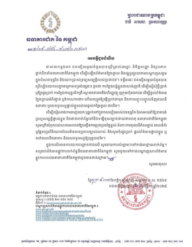 | ធនាគារជាតិនៃកម្ពុជា ក្រើនរម្លឹកឱ្យមានការប្រុងប្រយ័ត្នខ្ពស់ ដើម្បីចៀសវាងការចាញ់បោក ឬធ្លាក់ក្នុងកលល្បិចរបស់ជនទុច្ចរិត ដែលនាំឱ្យខាតបង់ទ្រព្យសម្បត្តិផ្ទាល់ខ្លួន និងជាប់ពាក់ព័ន្ធនឹងទង្វើខុសច្បាប់ជាយថាហេតុ |
