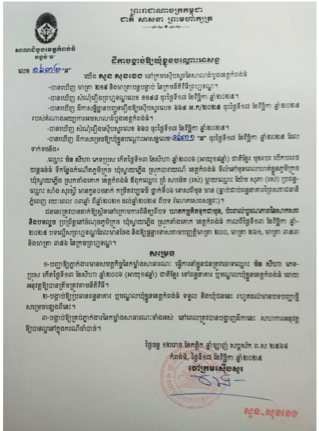 ខេត្តកំពង់ធំ៖នៅថ្ងៃទី១៨ ខែវិច្ឆិកា ឆ្នាំ២០២៥នេះ បានឲ្យដឹងថា ជននេះត្រូវបានចោទប្រកាន់ពីបទ «ឃាតកម្មគិតទុកជាមុន, ប៉ះពាល់បូរណភាព នៃសាកសព និងបទលួច» ប្រព្រឹត្តនៅភូមិក្រូច ឃុំស្វាយភ្លើង ស្រុកតាំងគោក ខេត្តកំពង់ធំ។ជនដៃដល់ដែលសម្លាប់ស្ដ្រីម្នាក់ រួចរំលោភសាកសពតាមក្រោយ ត្រូវបានចៅក្រមស៉ើបសួរ នៃសាលាដំបូងខេត្តកំពង់ធំ លោក សួន សុខខេង ចេញដីកាបង្គាប់ឲ្យឃុំខ្លួនដាក់ពន្ធនាគារ នៅថ្ងៃទី១៧ ខែវិច្ឆិកា ឆ្នាំ២០២៥ ដោយចោទប្រកាន់ចំនួន៣បទល្មើស។