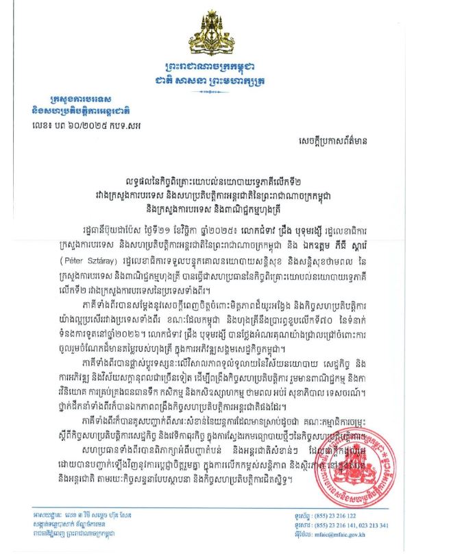 រាជធានីភ្នំពេញ៖ក្រសួងការបរទេស និងសហប្រតិបត្តិការអន្តរជាតិនៃកម្ពុជា បានបង្ហាញលទ្ធផលនៃកិច្ចប្រជុំពិគ្រោះយោបល់នយោបាយទ្វេភាគីលើកទី២ រវាងក្រសួងការបរទេស និងសហប្រតិបត្តិការអន្តរជាតិនៃព្រះរាជាណាចក្រកម្ពុជា និងក្រសួងការបរទេស និងពាណិជ្ជកម្មហុងគ្រី។