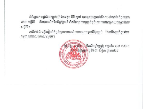 រាជធានីភ្នំពេញ៖ ក្រសួងការបរទេស និងសហប្រតិបត្តិការអន្តរជាតិកម្ពុជា នៅរសៀល ថ្ងៃទី២៥ ខែវិច្ឆិកា ឆ្នាំ២០២៥នេះ បានបើកកិច្ចប្រជុំមួយ ដើម្បីបន្តធ្វើបទបង្ហាញជូនអង្គទូតបរទេស និងទីភ្នាក់ងារអង្គការសហប្រជាជាតិប្រចាំកម្ពុជា អំពីការវិវត្តថ្មីៗនៃបញ្ហាព្រំដែនកម្ពុជា-ថៃ។