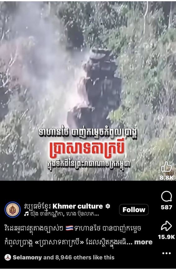 សេចក្តីជូនដំណឹង បានឲ្យដឹងបន្តថា នាថ្ងៃទី៩ ខែធ្នូ ឆ្នាំ២០២៥នេះ ប្រាសាទតាក្របី ជាទីគោរពសក្ការៈរបស់កម្ពុជា ក៏ទទួលរងនូវការបាញ់ បំផ្លាញយ៉ាងសាហាវ ដែលបង្ហាញនូវសកម្មភាពអសីលធម៌ និងការរំលោភបំពានលើបេតិកភណ្ឌវប្បធម៌របស់កម្ពុជា និងមនុស្សជាតិ។