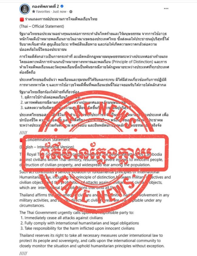 កម្ពុជាទាមទារឱ្យបណ្តាញសារព័ត៌មានថៃទាំងផ្លូវការនិងក្រៅផ្លូវការបញ្ឈប់រាល់ការផ្សព្វផ្សាយព័ត៌មានមិនពិតដោយចេតនា ក្នុងគោលដៅដើម្បីបំភាន់បោកប្រាស់សារធារណៈជាពិសេសេប្រជាជនថៃ ដើម្បីមួលបង្កាច់ លាបព័ណ៌ប្រទេសកម្ពុជា ក្នុងគោលដៅសម្រេចមហិច្ឆិតាពង្រីកសមរភូមិ៕
