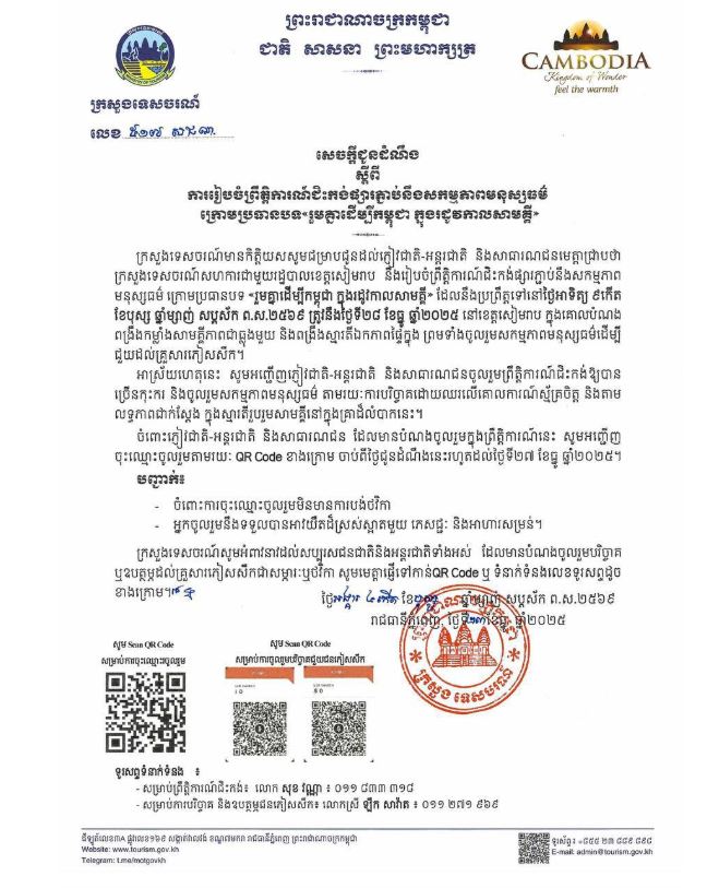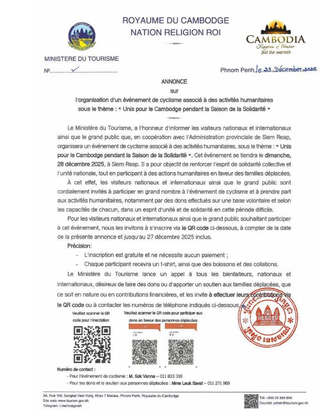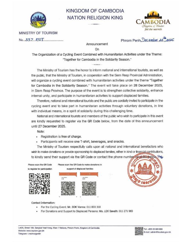 រាជធានីភ្នំពេញ៖យោងតាមសេចក្តីជូនដំណឹង របស់ក្រសួងទេសចរណ៍នៅថ្ងៃទី២៣ ខែធ្នូ ឆ្នាំ២០២៥នេះ បានឲ្យដឹងថា ក្រសួងទេសចរណ៍មានកិត្តិយសសូមជម្រាបជូនដល់ភ្ញៀវជាតិ-អន្តរជាតិ និងសាធារណជនមេត្តាជ្រាបថា ក្រសួងទេសចរណ៍សហការជាមួយរដ្ឋបាលខេត្តសៀមរាប នឹងរៀបចំព្រឹត្តិការណ៍ជិះកង់ផ្សារភ្ជាប់នឹងសកម្មភាព មនុស្សធម៌ ក្រោមប្រធានបទ «រួមគ្នាដើម្បីកម្ពុជា ក្នុងរដូវកាលសាមគ្គី» ដែលនឹងប្រព្រឹត្តទៅនៅថ្ងៃអាទិត្យ ៩កើត ខែបុស្ស ឆ្នាំម្សាញ់ សប្តស័ក ព.ស.២៥៦៩ ត្រូវនឹងថ្ងៃទី២៨ ខែធ្នូ ឆ្នាំ២០២៥ នៅខេត្តសៀមរាប ក្នុងគោលបំណង ពង្រឹងកម្លាំងសាមគ្គីភាពជាធ្លុងមួយ និងពង្រឹងស្មារតីឯកភាពផ្ទៃក្នុង ព្រមទាំងចូលរួមសកម្មភាពមនុស្សធម៌ដើម្បី ជួយដល់គ្រួសារភៀសសឹក។