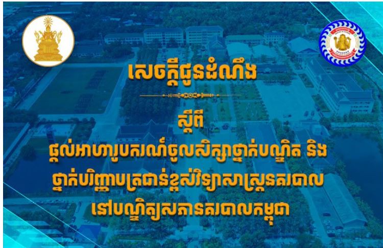 | បណ្ឌិត្យសភានគរបាលកម្ពុជា ចេញសេចក្តីជូនដំណឹង ស្តីពីការផ្តល់អាហារូបករណ៍ឱ្យចូលសិក្សា ថ្នាក់បណ្ឌិត និង ថ្នាក់បរិញ្ញាបត្រជាន់ខ្ពស់វិទ្យាសាស្ដ្រនគរបាល |