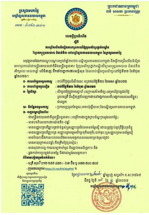 - កាលបរិច្ឆេទទទួលពាក្យ: ចាប់ពីថ្ងៃជូនដំណឹងនេះ រហូតដល់ថ្ងៃទី៣០ ខែមេសា ឆ្នាំ២០២៦