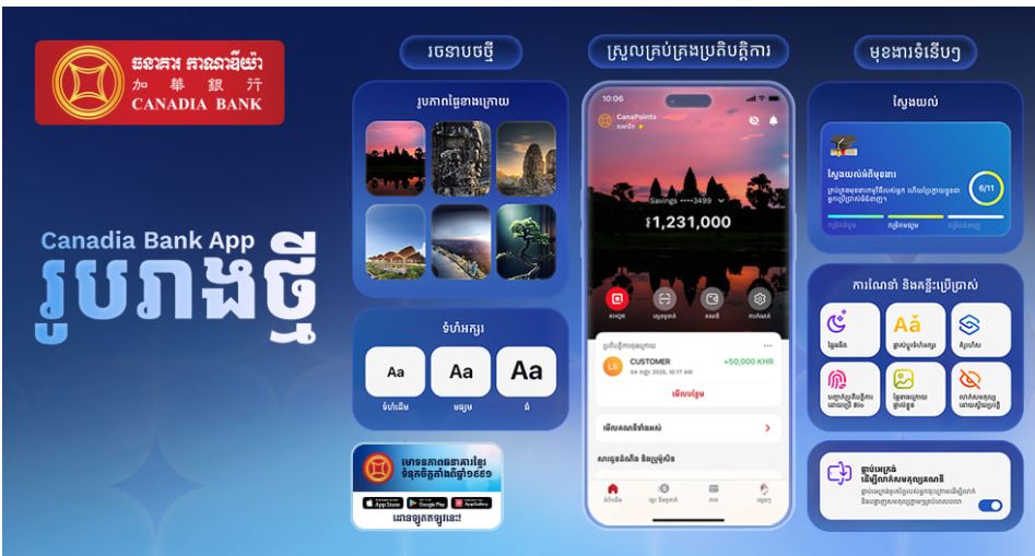 កម្មវិធីទូរសព្ទដៃ Canadia Bank App ថ្មីនេះមានលក្ខណៈ ទំនើប និងងាយស្រួលប្រើប្រាស់ ដែលអនុញ្ញាតឱ្យអតិថិជនកំណត់ដំណើរប្រតិបត្តិការធនាគារបែបឌីជីថលបានដោយខ្លួនឯង។ កម្មវិធីនេះត្រូវបានរចនាឡើងដើម្បីធ្វើឱ្យការគ្រប់គ្រងគណនីប្រចាំថ្ងៃមានភាពសាមញ្ញ ផ្តល់ជូននូវទម្រង់រូបរាងដែលអាចប្ដូរតាមចំណង់ចំណូលចិត្ត និងភ្ជាប់ជាមួយវិធានការសុវត្ថិភាពកម្រិតខ្ពស់។ មុខងារប្រសើរឡើងដូចជាការចូលដោយការផ្ទៀងផ្ទាត់ជីវមាត្រ (Biometric Login) ការជូនដំណឹងប្រតិបត្តិការផ្សេងៗតាមពេលវេលាជាក់ស្តែង និងតម្រងប្រតិបត្តិការដ៏ទូលំទូលាយ ផ្តល់ឱ្យអ្នកប្រើប្រាស់នូវការគ្រប់គ្រងដោយខ្លួនឯង ភាពងាយស្រួល និងទំនុកចិត្តកាន់តែច្រើន ដែលឆ្លុះបញ្ចាំងពីការប្តេជ្ញាចិត្តរបស់ធនាគារចំពោះការរចនាដែលផ្តោតលើអ្នកប្រើប្រាស់ និងនវានុវត្តឌីជីថល។ លក្ខណៈពិសេសសំខាន់មួយទៀតគឺការបើកគណនីដោយខ្លួនឯងភ្លាមៗក្នុងរយៈពេលត្រឹមតែប៉ុន្មាននាទីប៉ុណ្ណោះ ជាមួយនឹងអត្តសញ្ញាណប័ណ្ណដែលមានសុពលភាព ដែលជួយសន្សំសំចៃពេលវេលារបស់អតិថិជនក្នុងការអញ្ជើញទៅសាខាដោយផ្ទាល់។