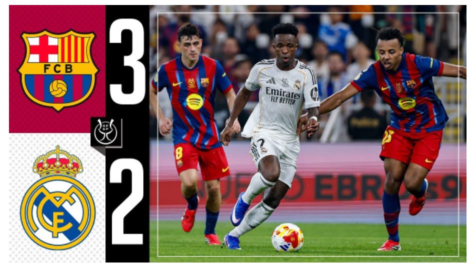 Spanish Super Cup 2026 ឃើញថាក្រុម Real Madrid នៅតែមិនអាចសងសឹងក្រុម Barca បានទេ ដែលស្ថិតក្នុងការប្រកួតនេះកីឡាករអន្តរជាតិប្រេស៊ីល Raphinha រកបានពីរគ្រាប់ម្នាក់ឯង និងមិត្តរួមក្រុម Lewandowski រកបានមួយគ្រាប់ផងដែរ ។ ដ្បិតប្រយុទ្ធជួរមុខរបស់ Real គឺកីឡាករ Vinicius Junior និង Gonzalo Garcia ក្នុងវគ្គផ្តាច់ព្រ័ត្រកាលពីថ្ងៃអាទិត្យនៅទីក្រុង Jeddah ប្រទេសអារ៉ាប៊ីសាអូឌី ។