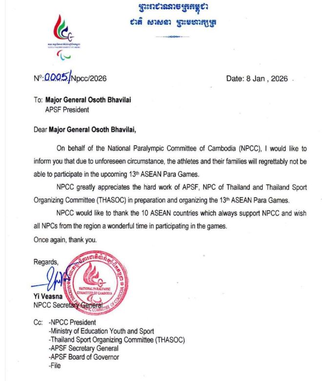 គណៈកម្មាធិការជាតិប៉ារ៉ាឡាំពិកកម្ពុជា បានផ្ញើលិខិតទៅសហព័ន្ធកីឡាជនពិការអាស៊ីអាគ្នេយ៍ ស្តីពីការដកខ្លួនពីការចូលរួមព្រឹត្តិការណ៍ប្រកួតកីឡាជនពិការអាស៊ីអាគ្នេយ៍ ឬកីឡាអាស៊ានប៉ារ៉ាហ្គេម លើកទី១៣ ដែលគ្រោងនឹងប្រព្រឹត្តទៅពីថ្ងៃទី២០ ដល់ទីថ្ងៃទី២៦ ខែមករា ឆ្នាំ២០២៦ ខាងមុខ នៅប្រទេសថៃ។