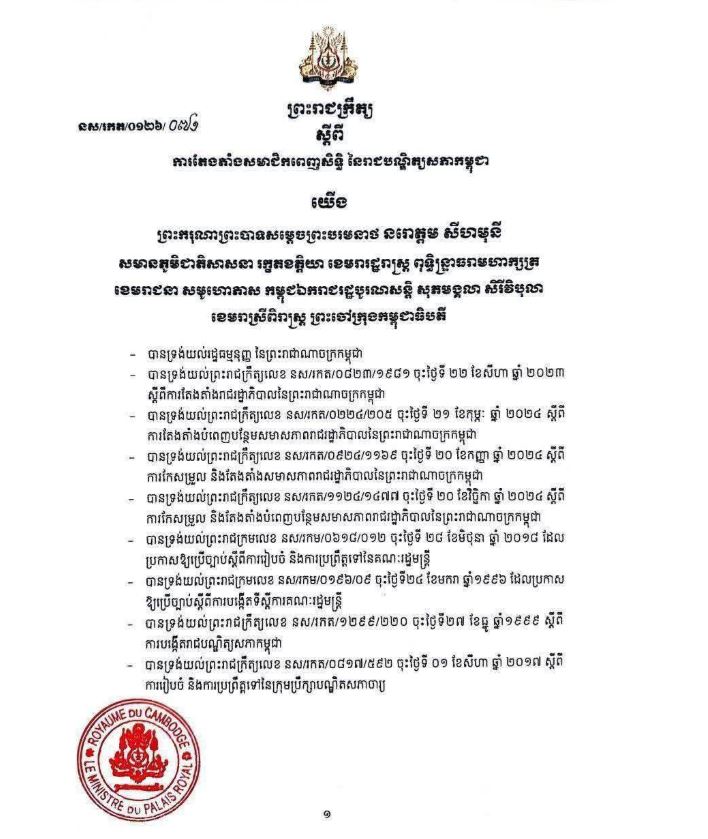 រាជធានីភ្នំពេញ៖ ព្រឹទ្ធសភា នឹងបើកកិច្ចប្រជុំគណៈកម្មាធិការអចិន្ត្រៃយ៍ព្រឹទ្ធសភា នីតិកាលទី៥ នៅព្រឹកថ្ងៃចន្ទ ទី១៩ ខែមករា ឆ្នាំ២០២៦ វេលាម៉ោង៨:៣០នាទី នៅវិមានព្រឹទ្ធសភា។