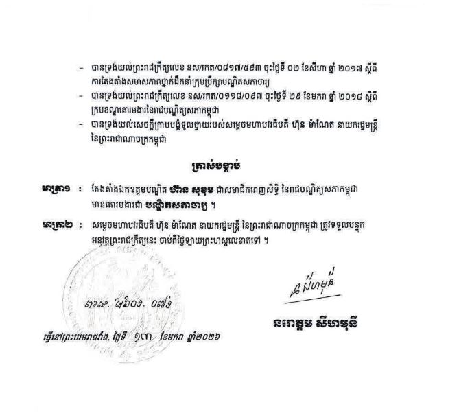 រាជធានីភ្នំពេញ៖សម្តេចបវរធិបតី ហ៊ុន ម៉ាណែត នាយករដ្ឋមន្ត្រីនៃកម្ពុជា បានចេញអនុក្រឹត្យតែងតាំងបណ្ឌិត ហ៊ាន សុខុម ជាសមាជិកពេញសិទ្ធិ នៃរាជបណ្ឌិត្យសភាកម្ពុជា មានគោរមងារជា បណ្ឌិតសភាចារ្យ៕