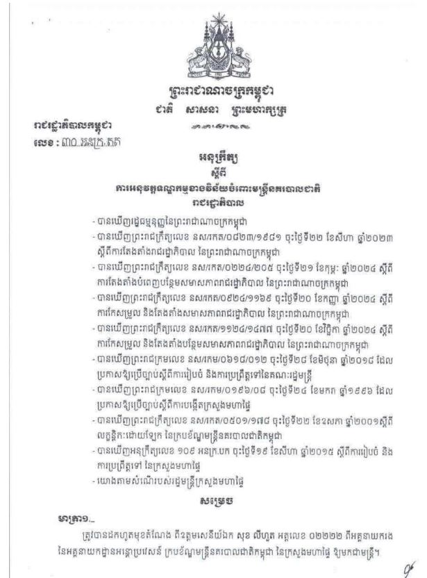 រាជធានីភ្នំពេញ៖ សម្ដេចបវរធិបតី ហ៊ុន ម៉ាណែត នាយករដ្ឋមន្ដ្រីនៃកម្ពុជា បានចេញអនុក្រឹត្យ សម្រេចដកហូតមុខតំណែង ឧត្តមសេនីយ៍ឯក សុខ លីហួត អគ្គលេខ ០២២២២ ពីអគ្គនាយករង នៃអគ្គនាយកដ្ឋានអន្តោប្រវេសន៍ ក្របខ័ណ្ឌមន្ត្រីនគរបាលជាតិកម្ពុជា នៃក្រសួងមហាផ្ទៃ ឱ្យមកជាមន្ត្រី។