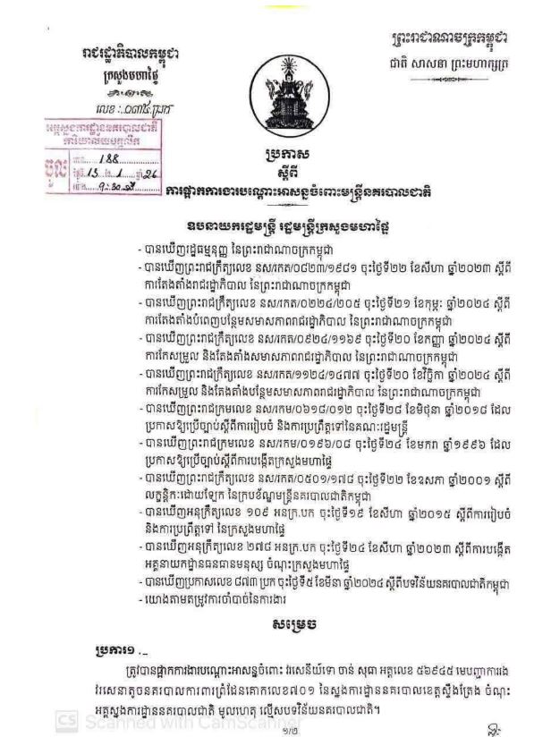 ១៖ ឧត្តមសេនីយ៍ត្រី ចាន់ សុផា អត្តលេខ០២០៤៦ ត្រូវបានដកហូតមុខតំណែងពីស្នងការរងទទួលការងារព្រំដែន នៃស្នងការដ្ឋាននគរបាលខេត្តស្ទឹងត្រែង ឱ្យមកជាមន្ត្រី។