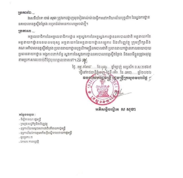 ២៖ វរសេនីយ៍ទោ ចាន់ សុធា អត្តលេខ៥៦៩៤៥ មេបញ្ជាការរង វរសេនាតូចនគរបាលការពារព្រំដែនគោកលេខ៧៩១ នៃស្នងការដ្ឋាននគរបាលខេត្តស្ទឹងត្រែង ត្រូវបានផ្អាកការងារបណ្តោះអាសន្ន។